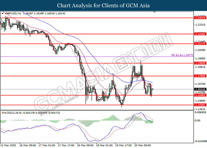 GBPUSD, H1: GBPUSD was traded higher following prior rebound near the support level at 1.1545. MACD which illustrate diminishing bearish momentum suggest the pair to be traded higher toward the resistance level at 1.1760.