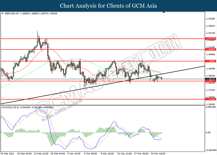 GBPUSD, H4: GBPUSD was traded lower while currently testing the support level at 1.3875. However, MACD which illustrated diminishing bearish momentum suggest the pair to be traded higher in short-term as technical correction.