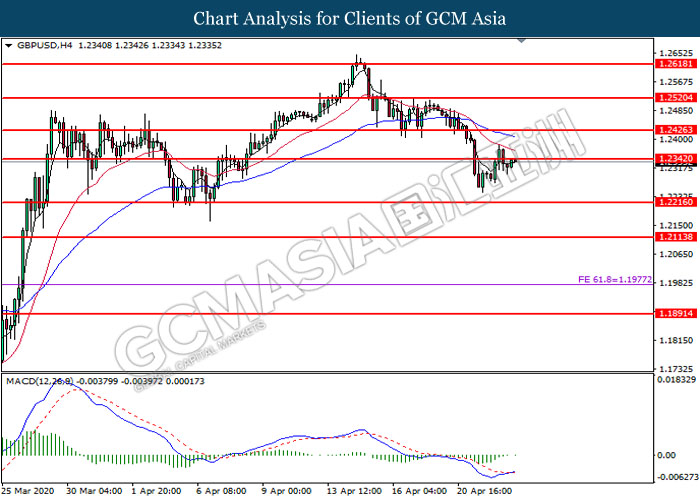 GBPUSD, H4: GBPUSD was traded higher while currently testing the resistance level at 1.2340. MACD which illustrate diminishing bearish momentum suggest the pair to extend its gains after it successfully breakout above the resistance level.