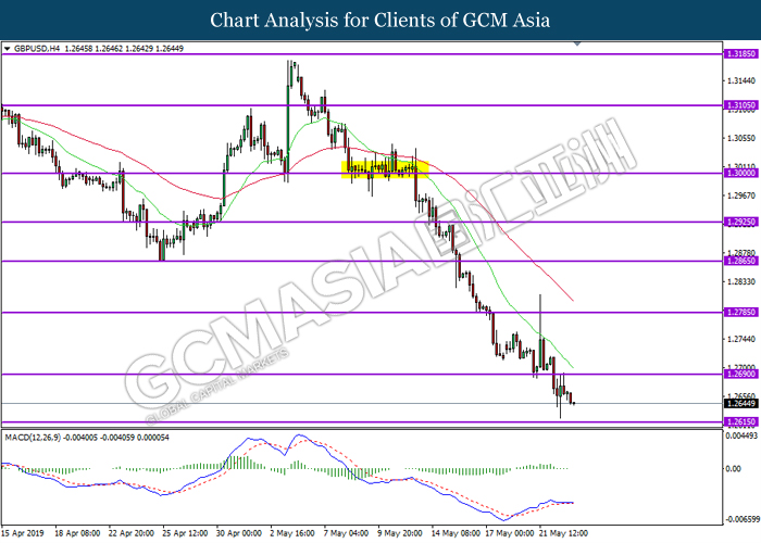 GBPUSD, H4: GBPUSD was traded lower following prior retracement from the resistance level 1.2690. MACD which display diminished bullish momentum suggest the pair to extend its losses towards the support level 1.2615.