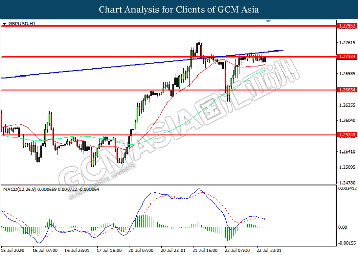 GBPUSD, H1: GBPUSD was traded higher while currently testing the resistance level at 1.2735. However, MACD which illustrated increasing bearish momentum suggest the pair to be traded lower in short-term as technical correction.