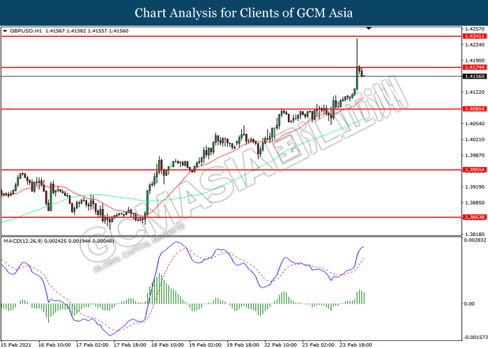 GBPUSD, H1: GBPUSD was traded higher while currently testing the resistance level at 1.4175. However, MACD which illustrated diminishing bullish momentum suggest the pair to be traded lower in short-term as technical correction.