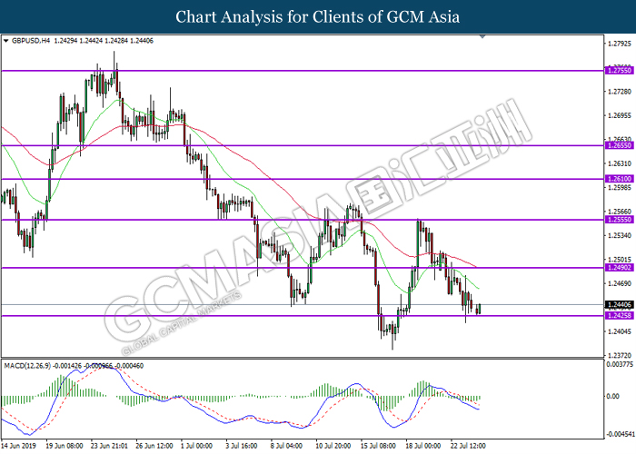 GBPUSD, H4: GBPUSD was traded lower while currently testing near the support level 1.2425. However, MACD which illustrate diminishing bearish momentum suggest the pair to undergo short-term technical correction and rebound towards the resistance level 1.2490.
