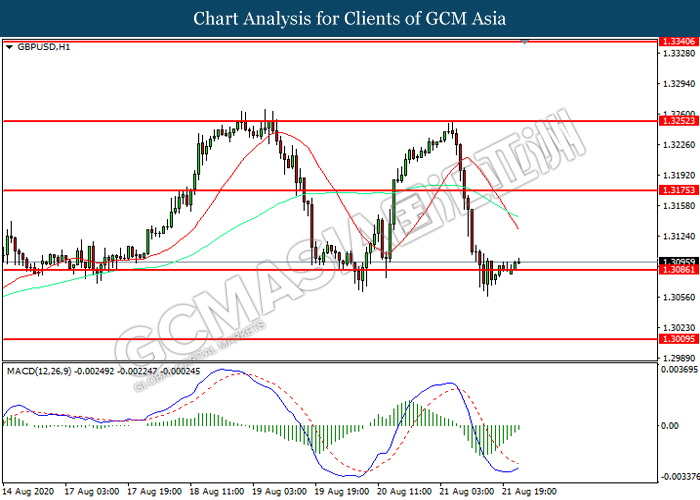 GBPUSD, H1: GBPUSD was traded lower while currently testing the support level at 1.3085. However, MACD which illustrated diminishing bearish momentum suggest the pair to be traded higher in short-term as technical correction.