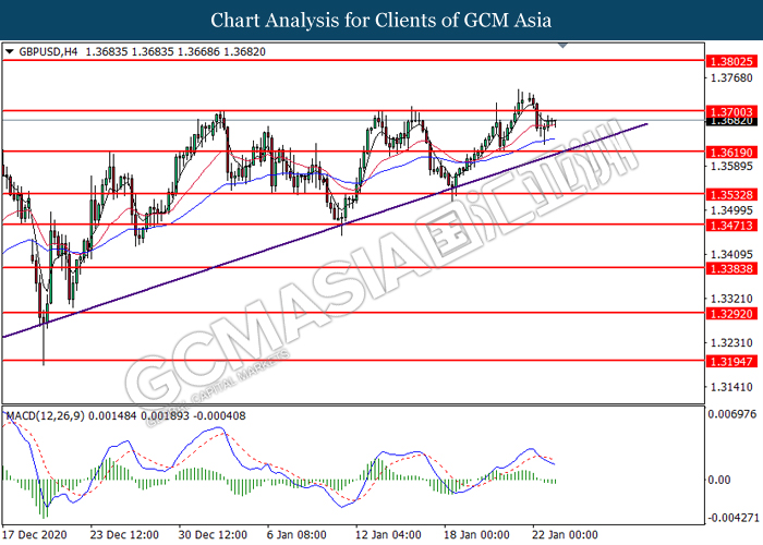 GBPUSD, H4: GBPUSD was traded higher following prior rebound from the lower level. MACD which illustrated diminishing bearish momentum suggest the pair to be traded higher toward the resistance level at 1.3700.