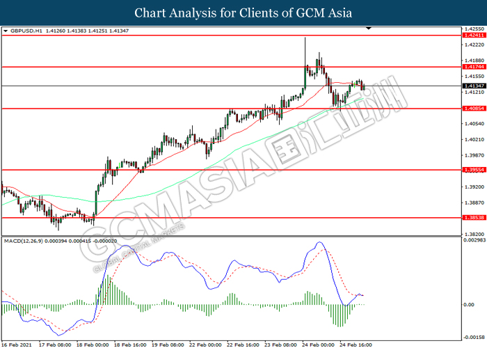 GBPUSD, H1: GBPUSD was traded higher following prior rebound from the support level at 1.4085. MACD which illustrated diminishing bearish momentum suggest the pair to extend its gains toward resistance level at 1.4175.