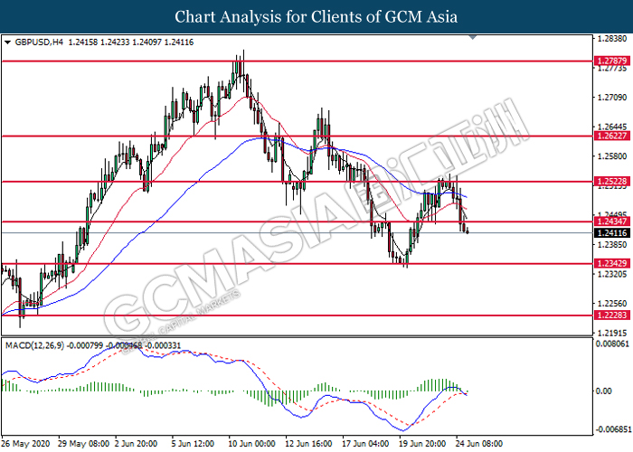 GBPUSD, H4: GBPUSD was traded lower following prior breakout below the previous support level at 1.2435. MACD which illustrate diminishing bullish momentum suggest the pair to extend its losses toward the support level at 1.2345.