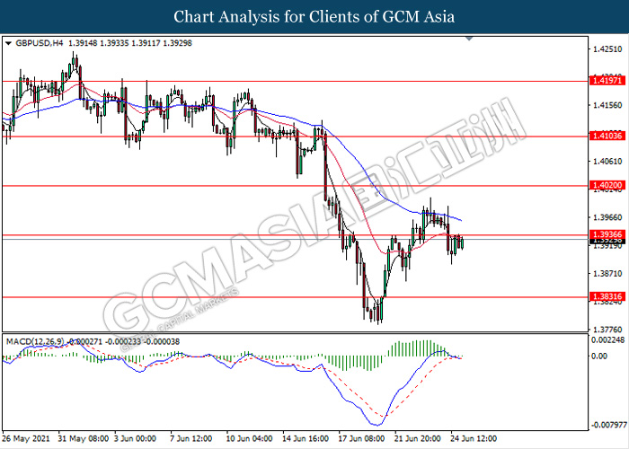 GBPUSD, H4: GBPUSD was traded lower following recent breakout below the previous support level 1.3935. MACD which illustrate bearish bias signal with the formation of death cross suggest the pair to extend its losses towards the support level 1.3830.