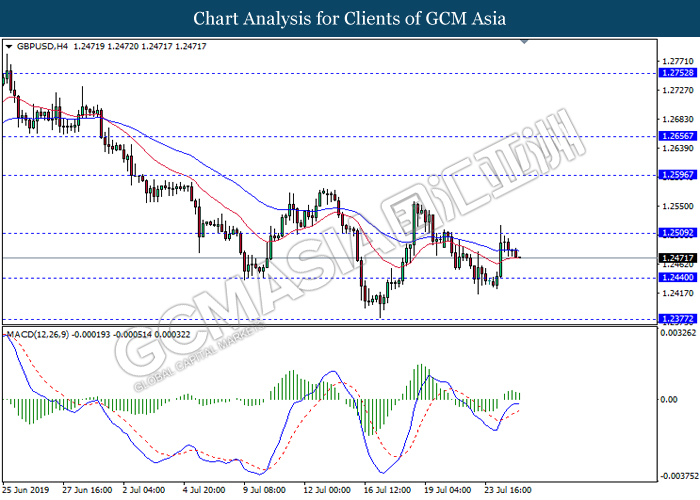 GBPUSD, H4: GBPUSD was traded lower following prior retracement from the resistance level 1.2510. MACD which illustrate diminishing bullish momentum suggest the pair to extend its retracement towards the support level 1.2440.