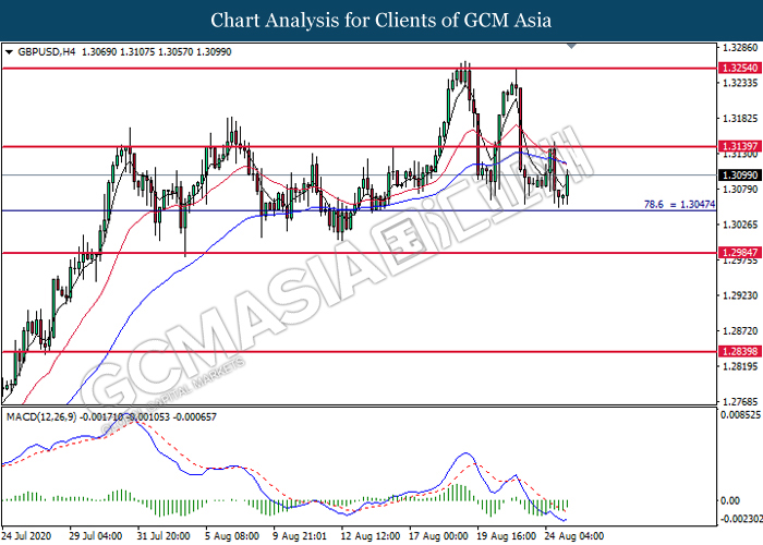 GBPUSD, H4: GBPUSD was traded higher following prior rebound from the support level at 1.3045. MACD which illustrate diminishing bearish momentum signal suggest the pair to extend its rebound toward the resistance level at 1.3140.