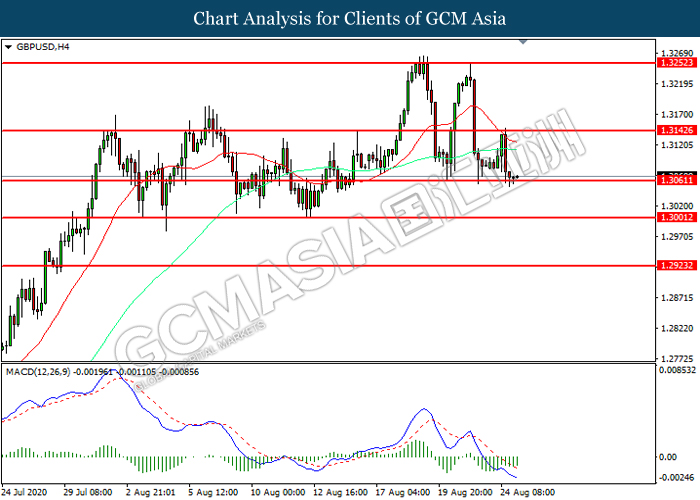 GBPUSD, H4: GBPUSD was traded lower while currently testing the support level at 1.3060. However, MACD which illustrated diminishing bearish momentum suggest the pair to be traded higher in short-term as technical correction.