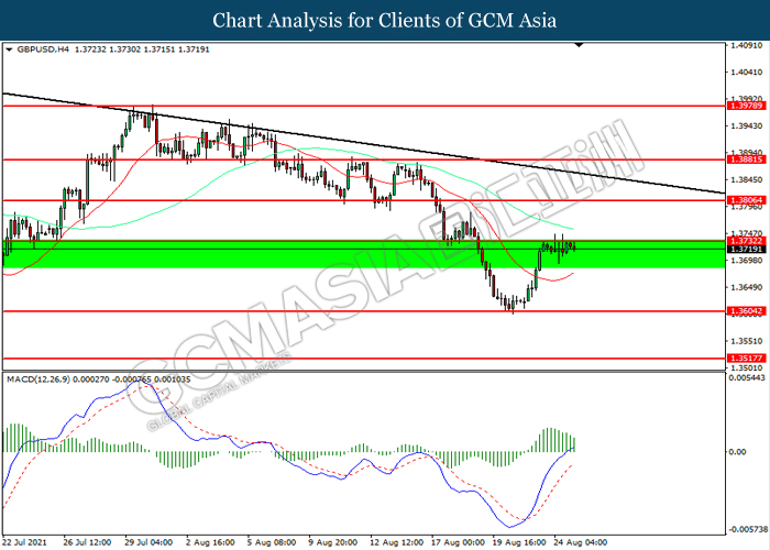 GBPUSD, H4: GBPUSD was traded higher while currently testing the resistance level at 1.3730. However, MACD which illustrated diminishing bullish momentum suggest the pair to be traded lower in short-term as technical correction.
