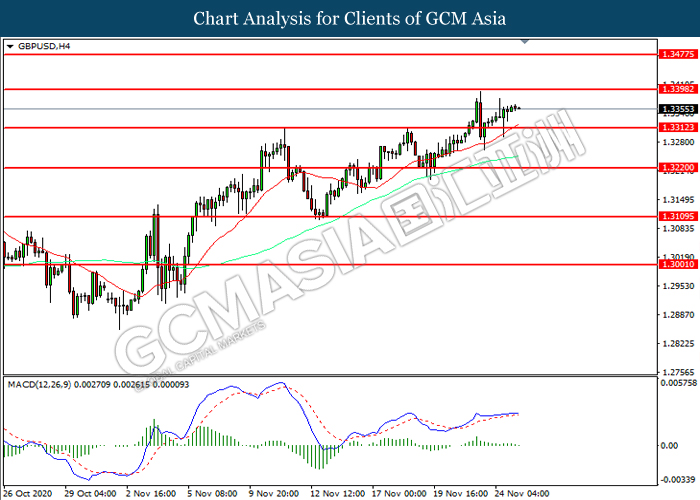 GBPUSD, H4: GBPUSD was traded higher following prior rebound from the support level at 1.3310. However, MACD which illustrated diminishing bullish momentum suggest the pair to be traded lower in short-term as technical correction.