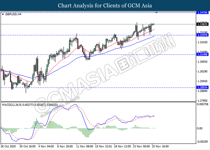 GBPUSD, H4: GBPUSD was traded higher following recent rebound from its low level. MACD which illustrate bullish bias signal suggest the pair to extend its gains towards the resistance level 1.3470.
