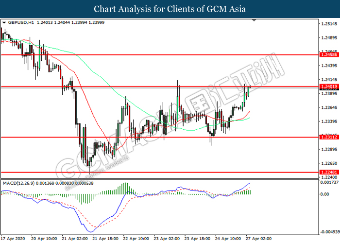 GBPUSD, H1: GBPUSD was traded higher while currently testing the resistance level at 1.2400. MACD which illustrated increasing bullish momentum suggest the pair to extend its gains after it successfully breakout above the resistance level.