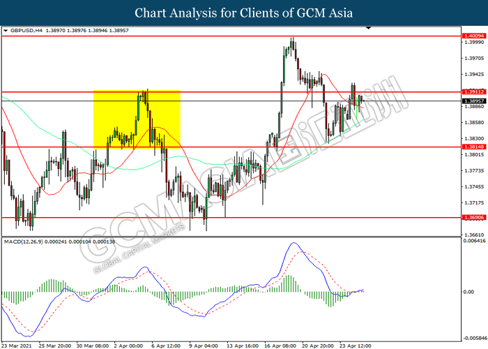 GBPUSD, H4: GBPUSD was traded higher while currently testing the resistance level at 1.3910. MACD which illustrated diminishing bearish momentum suggest the pair to extend its gains after it successfully breakout above the resistance level.
