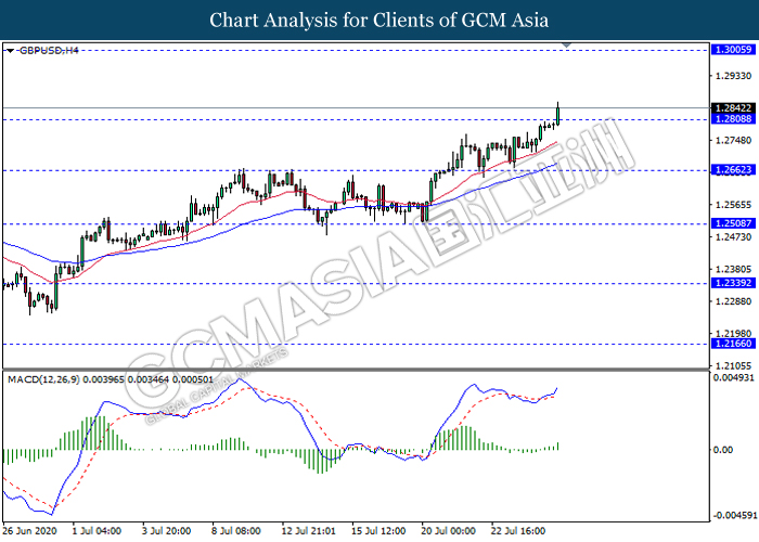 GBPUSD, H4: GBPUSD was traded higher following prior breakout above the previous resistance level 1.2810. MACD which illustrate bullish momentum signal suggest the pair to extend its gains towards the resistance level 1.3005.