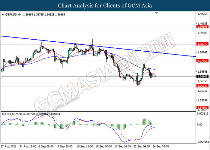 GBPUSD, H4: GBPUSD was traded lower following recent retracement from its high level. MACD which illustrate diminishing bullish momentum signal suggest the pair to extend its retracement towards the support level 1.3605.