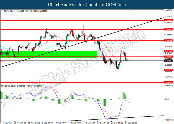 GBPUSD, H4: GBPUSD was traded lower following prior breakout below the previous support level at 1.3695. MACD which illustrated diminishing bullish momentum suggest the pair to extend its losses toward support level at 1.3605.