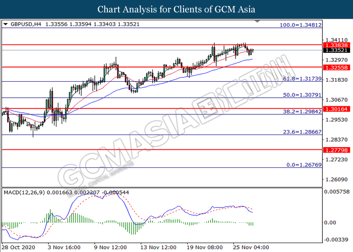 GBPUSD, H4: GBPUSD was traded lower following prior retracement from the resistance level at 1.3385. MACD which illustrates bearish bias momentum suggest the pair to extend its losses toward the support level at 1.3255.