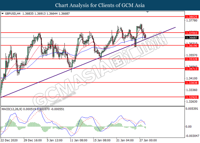GBPUSD, H4: GBPUSD was traded lower while currently testing the upward trendline. MACD which illustrated bearish bias momentum suggest the pair to be traded lower after it successfully breakout below the upward trendline.