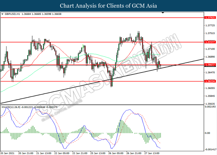 GBPUSD, H1: GBPUSD was traded lower while currently testing the support level at 1.3665. However, MACD which illustrated diminishing bearish momentum suggest the pair to be traded higher in short-term as technical correction.