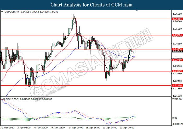 GBPUSD, H4: GBPUSD was traded lower following prior retracement from the resistance level at 1.2435. MACD which illustrate diminishing bullish momentum suggest the pair to be traded lower toward the support level at 1.2370.