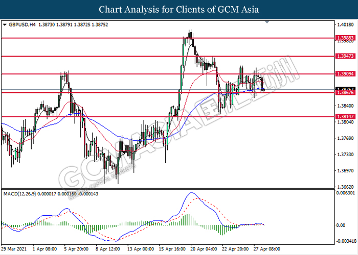 GBPUSD, H4: GBPUSD was traded lower while currently testing the support level at 1.3865. MACD which illustrated bearish signal suggest the pair to extend its losses after it successfully breakout below the support level.