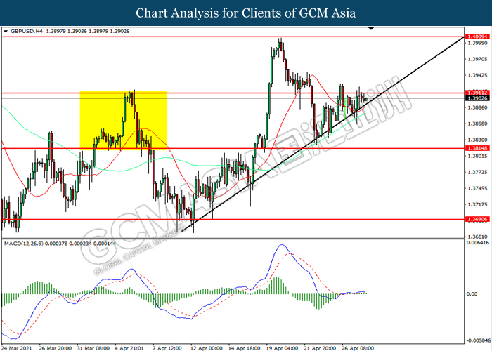 GBPUSD, H4: GBPUSD was traded higher while currently testing the resistance level at 1.3910. MACD which illustrated diminishing bearish momentum suggest the pair to extend its gains after it successfully breakout above the resistance level.