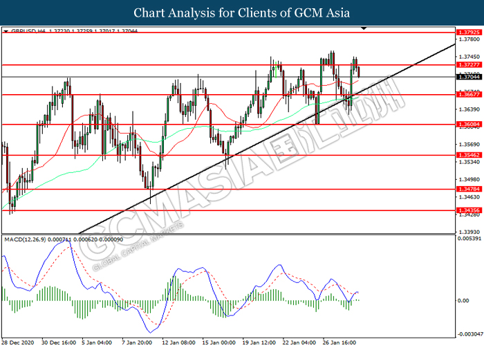 GBPUSD, H4: GBPUSD was traded lower following prior retracement form the resistance level at 1.3725. MACD which illustrated diminishing bullish momentum suggest the pair to extend its losses toward support level at 1.3665.