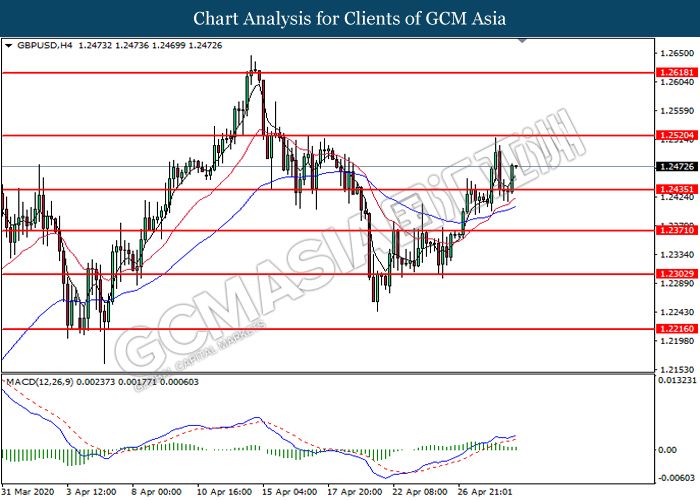 GBPUSD, H4: GBPUSD was traded higher following prior rebound from the support level at 1.2435. MACD which illustrate bullish bias momentum suggest the pair to be traded higher toward the resistance level at 1.2520.