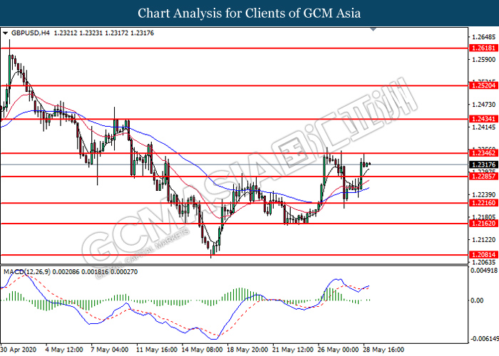 GBPUSD, H4: GBPUSD was traded higher following prior breakout above the previous resistance level at 1.2285. MACD which illustrate bullish momentum with the formation of golden cross suggest the pair to extend its gains toward the resistance level at 1.2345.