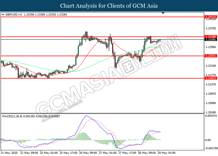 GBPUSD, H1: GBPUSD was traded higher while currently testing the resistance level at 1.2340. However, MACD which illustrated diminishing bullish momentum suggest the pair to be traded lower in short-term as technical correction.