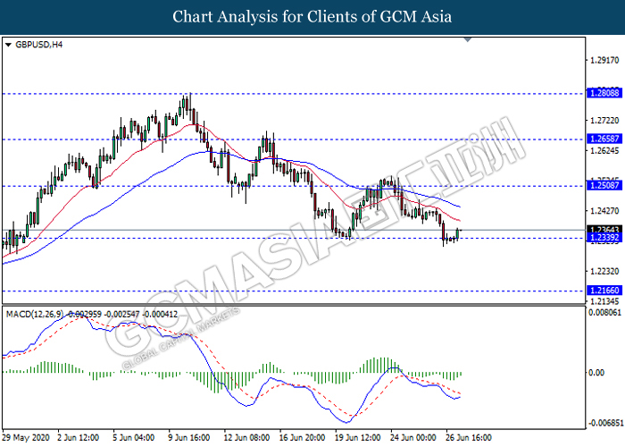 GBPUSD, H4: GBPUSD was traded higher following prior rebound from the support level 1.2340. MACD which illustrate diminishing bearish momentum signal suggest the pair to extend its rebound towards the resistance level 1.2510.