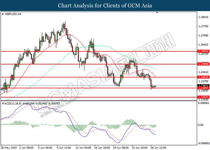 GBPUSD, H4: GBPUSD was traded lower while currently testing the support level at 1.2325. However, MACD which illustrated diminishing bearish momentum suggest the pair to be traded higher in short-term as technical correction.