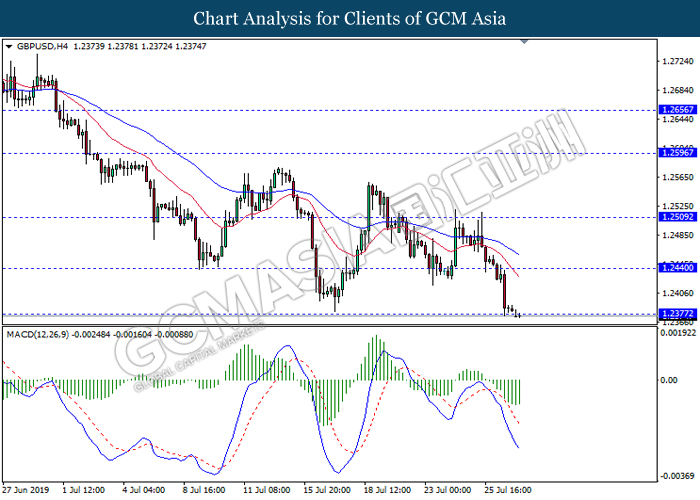 GBPUSD, H4: GBPUSD was traded lower while currently testing the support level 1.2375. However, MACD which illustrate diminishing bearish momentum suggest the pair to experience a technical correction in short term towards the resistance level 1.2440.
