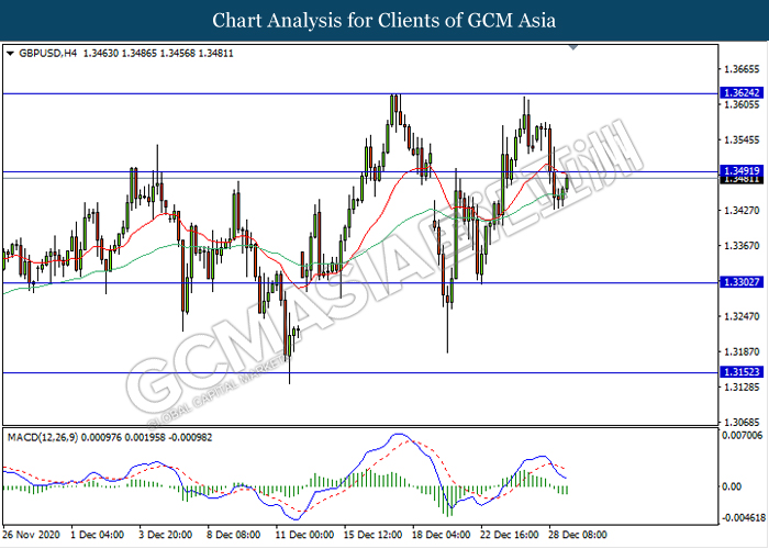 GBPUSD, H4: GBPUSD was traded lower following recent breakout below the previous support level 1.3490. MACD which illustrate bearish momentum signal with the recent formation of death cross suggest the pair to extend its losses towards the support level 1.3300.