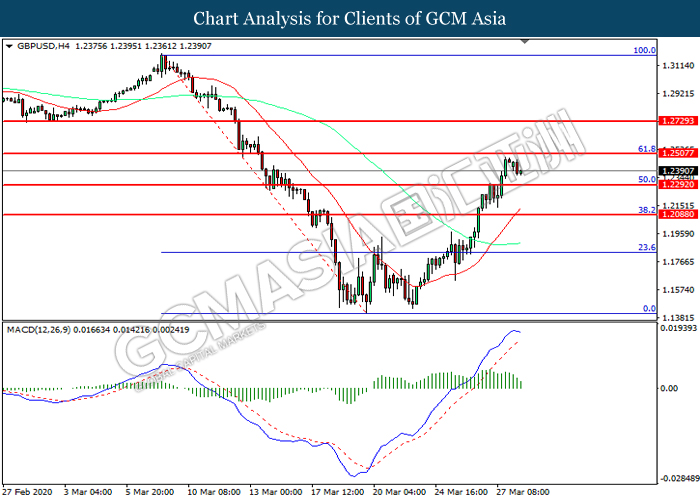 GBPUSD, H4: GBPUSD was traded lower following prior retracement from the resistance level at 1.2505. MACD which illustrated diminishing bullish momentum suggest the pair to extend its losses toward support level at 1.2290.
