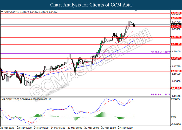GBPUSD, H1: GBPUSD was traded lower while currently testing the support level at 1.2390. MACD which illustrate diminishing bullish momentum suggest the pair to extend its losses after it successfully breakout below the support level at 1.2390.