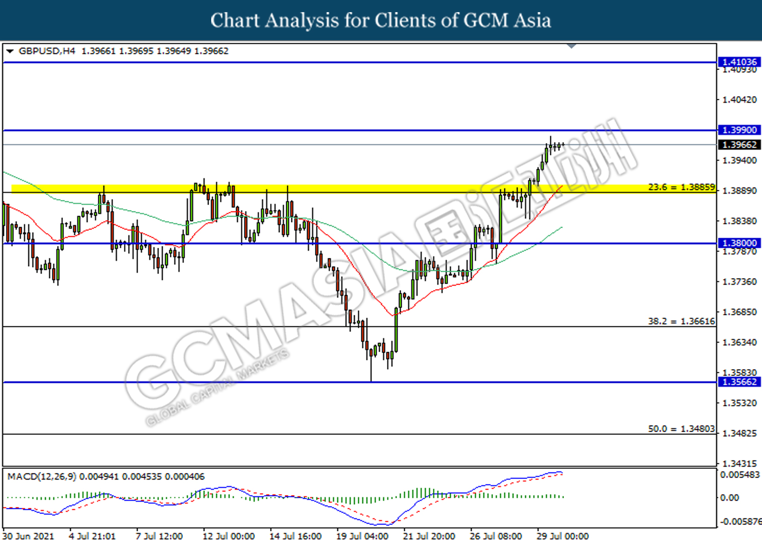 GBPUSD, H4: GBPUSD was traded higher following prior closure above 1.3885. MACD which illustrate bullish signal suggests the pair to extend its gains after closing above 1.3990.