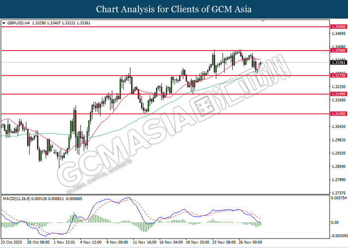 GBPUSD, H4: GBPUSD was traded higher following prior rebound from the lower level. MACD which portrays diminished downward momentum suggests the pair to extend its gains towards the resistance level of 1.3390.