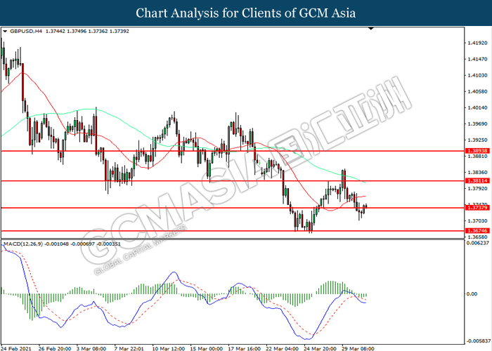 GBPUSD, H4: GBPUSD was traded lower while currently near the support level at 1.3740. However, MACD which illustrated diminishing bearish momentum suggest the pair to be traded higher in short-term as technical correction.
