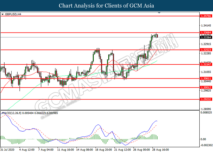 GBPUSD, H1: GBPUSD was traded higher while currently testing the resistance level at 1.3365. However, MACD which illustrated diminishing bullish momentum suggest the pair to be traded lower in short-term as technical correction.