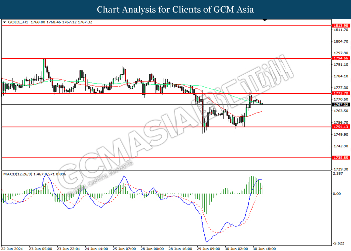 GOLD_, H1: Gold price was traded lower following prior retracement from the resistance level at 1773.70. MACD which illustrated diminishing bullish momentum suggest the commodity to extend its losses toward support level at 1754.15.