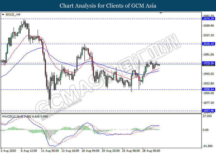 GOLD_, H4: Gold price was traded higher while currently testing the resistance level 1970.55. However, MACD which display diminishing bullish momentum signal suggest the commodity to be traded lower as a technical correction towards the support level 1908.55.