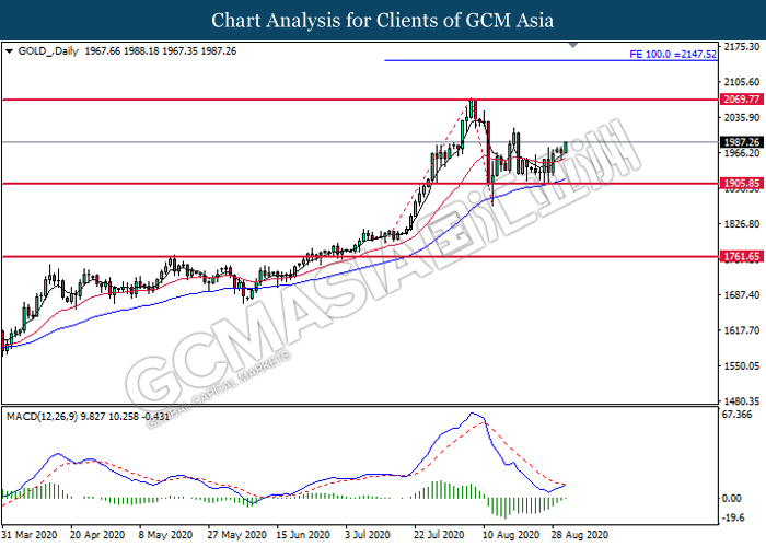 GOLD_, Daily: Gold price was traded higher following prior rebound from the support level at 1905.85. MACD which illustrated diminishing bearish momentum suggest the commodity to extend its gains toward the resistance level at 2069.75.