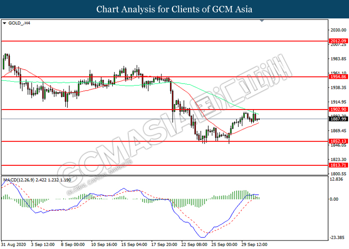 GOLD_, H4: Gold price was traded lower following prior retracement from the resistance level at 1902.90. MACD which illustrated diminishing bullish momentum suggest the commodity to extend its losses toward support level at 1852.15.