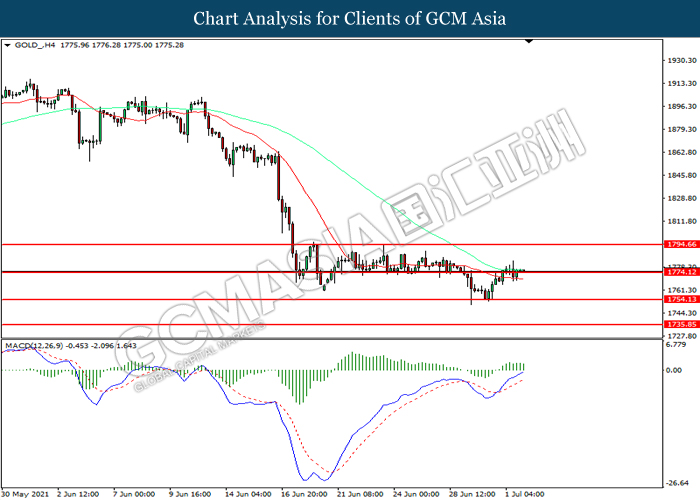 GOLD_, H4: Gold price was traded higher while currently testing the resistance level at 1774.10. However, MACD which illustrated diminishing bullish momentum suggest the commodity to be traded lower in short-term as technical correction.