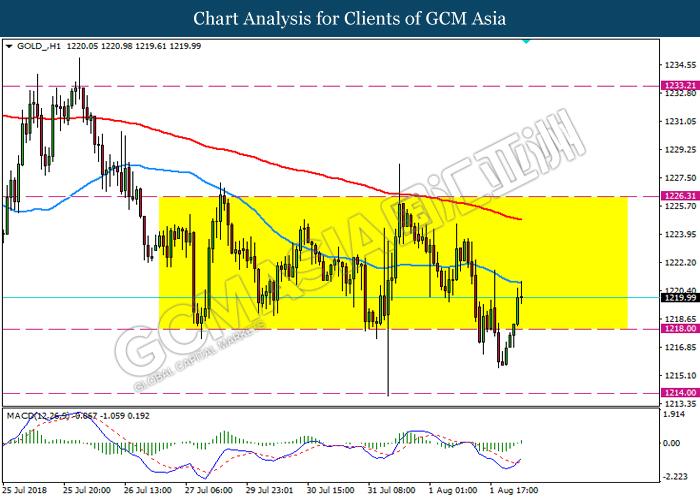 GOLD_, H1: Gold price remain traded in a sideway channel following a failed attempt for breakout below the support level 1218.00 and back to the sideway zone. MACD which display bullish signal with golden cross suggest the pair may be traded higher towards the resistance level 1226.00.