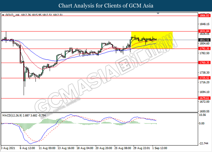 GOLD, H4: Gold price was traded flat in a sideway channel. However, MACD which illustrate bearish momentum signal suggest the commodity to be traded lower in short term towards the support level 1792.35.